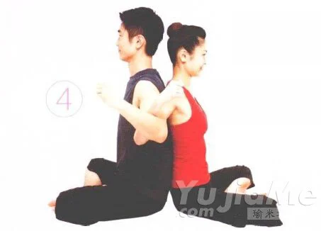 ④ 背對背坐好,兩人雙肘交叉,伸展背肌。