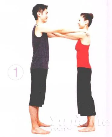 ① 面對面站立,雙腳開立,與腰同寬,兩手放在對方肩部。