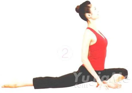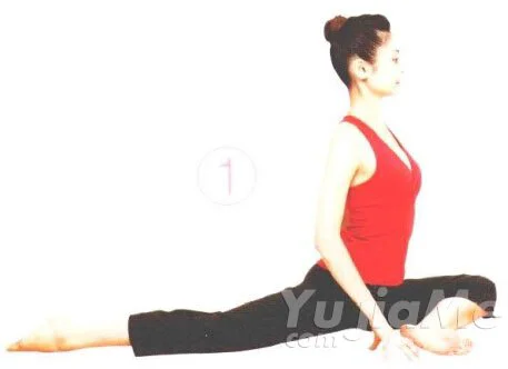① 彎曲左腿,腳趾尖伸直。右腿盡量向後伸直。腳趾尖正直向後。骨盆朝前坐正。