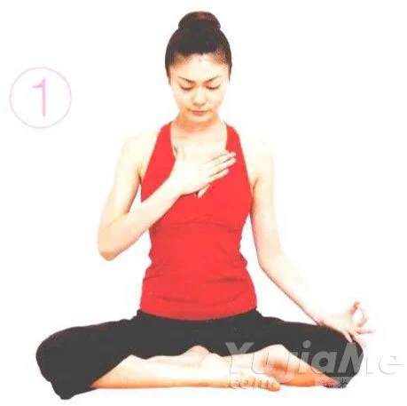 ① 保持放鬆的坐姿。右手放在胸部。左手食指和大拇指相扣,輕輕地放在膝蓋上(參考秦手印)。吸氣與呼氣的長短一致,深呼吸15-20次。