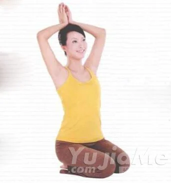 3、雙手向上伸展,在頭頂上方合十,手臂慢慢向下回收,手腕對著頭頂。