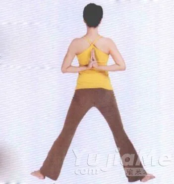 2、雙臂向後伸展,彎曲手肘,雙手在背後合十。