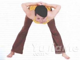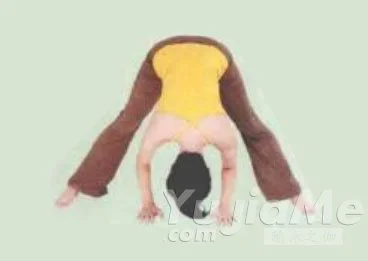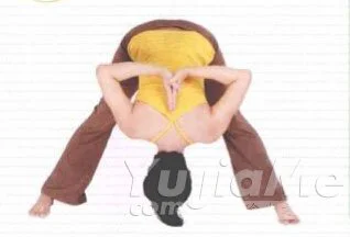 3、深深吸氣,呼氣時慢慢向前放低上身,直到頭部觸碰地面。這時頭頂正好在雙腳連線中點上,全身重心在雙腿上。保持這個姿勢10秒左右。