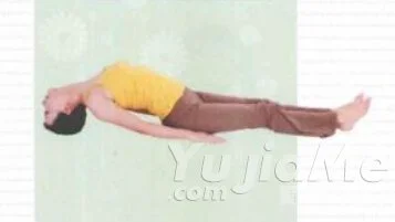 2、吸氣,慢慢向後放低上身,以頭部百會穴看地,雙手輕輕抓住腳尖;呼氣,身體盡量向上抬高胸部,保持5秒鐘後,身體慢慢放鬆。