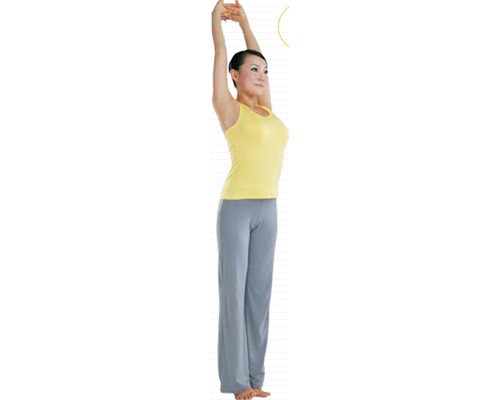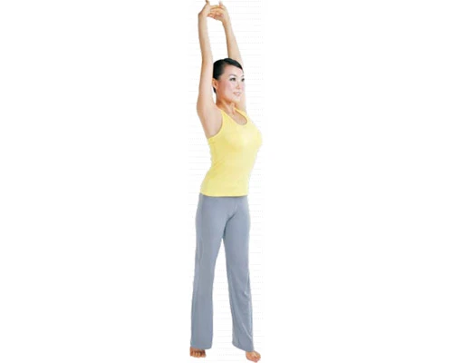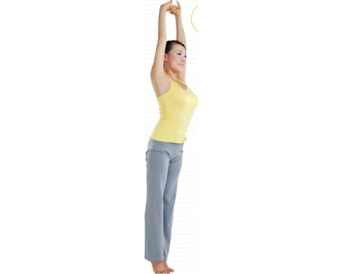 站立在墊子上,兩腳併攏,雙臂向頭頂上方伸展,翻轉手掌,掌心朝上。