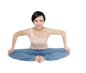 2.吸氣,彎曲雙膝,兩腳跟往陰部方向靠攏,呼氣,雙膝向兩側打開,腳心相對。雙手握住雙腳,上身挺直,將雙腳盡量拉近身體。