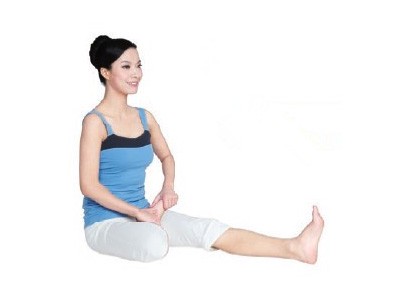 1端坐在墊子上,左腿向前伸直,彎曲右腿。 將右腳放到左大腿根部,腳掌心朝上,兩手扶住右腳掌。