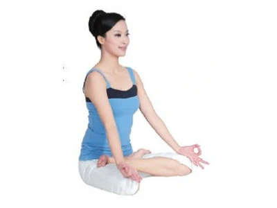2彎曲左腿,將左腿放在右大腿上,左腳跟抵住右側腹部,腳掌心朝上。雙手置於兩膝蓋上,成智慧指.盡量讓雙膝著地,且雙腿交換上下方向練習