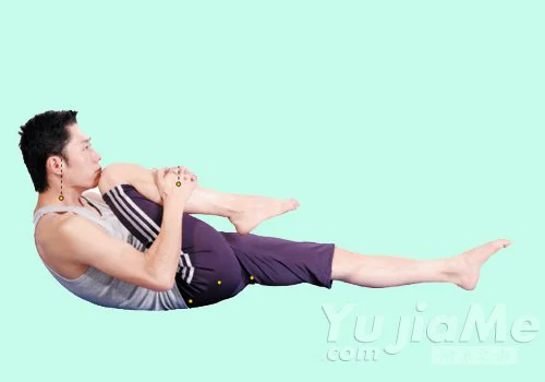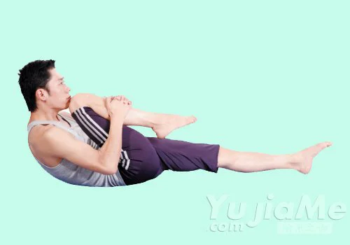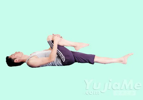 2、抬起右腿,右膝彎曲;雙手環抱住膝蓋,吸氣,吐氣時雙手略施壓力,將膝蓋壓向腹部。