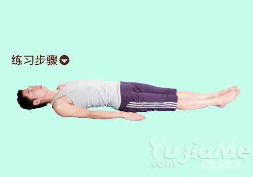 1、仰臥在墊子上,雙眼微閉,兩手放在身體兩側,兩腳伸直,腳尖併攏;正常呼吸,放鬆全身。