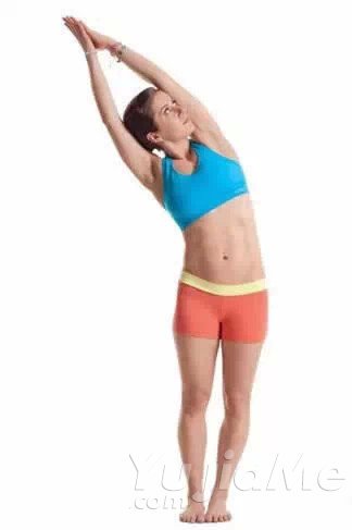加強版:雙臂伸直舉過頭頂,同時手掌相對,手肘向外。保持姿勢不變將身體傾斜彎向一側,然後另一側重複同樣的動作。