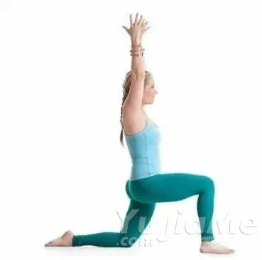 雙腳打開與肩同寬站立。右腳向前跨一大步,同時下降身體直至右腿彎曲90度、左膝接近地面。將身體重心放在前腳跟和後腳掌。接著將雙臂向上舉過頭頂,保持與肩同寬。然後將手掌合併,手臂伸直。保持這個動作30秒鐘,然後回到起始姿勢,接著左腿重複同樣的動作。