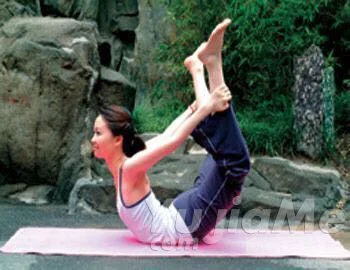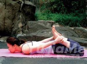 step2:吸氣,腰部用力,將上半身抬離地面,感覺後腰部得到拉伸。在可以的情況下,夾緊臀部,雙手用力,拉動雙腿,讓大腿抬離地面,整個身體像一張拉開的弓。頭微微後仰,雙眼睜開著上方即可。