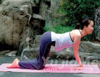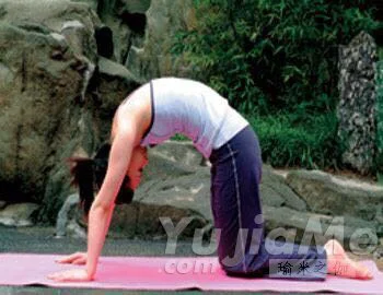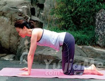Step3:呼氣,弓背,反方向活動腰椎,同時低頭,下巴盡力靠向胸部,從而使整個身體形成向上的弧線,感受腰背部肌肉的拉伸。