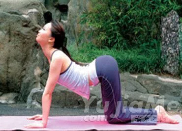 Step2:吸氣,腰背下壓,腹部用力貼向地面方向,雙肩下壓,挺胸。頭部後仰,臀部上翹,從而與背部形成向下的弧線,從而使腰、背部肌肉得到擠壓。