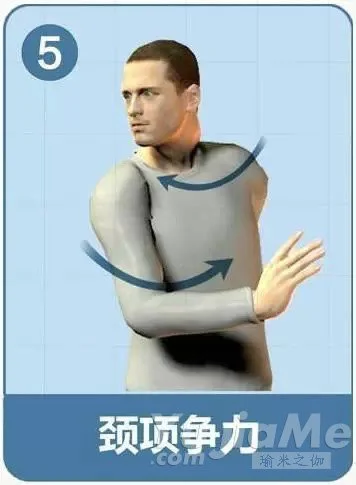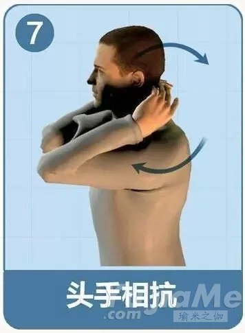 7、雙手交叉緊貼頸後,用力頂頭頸,頭頸向後用力,互相抵抗5次。