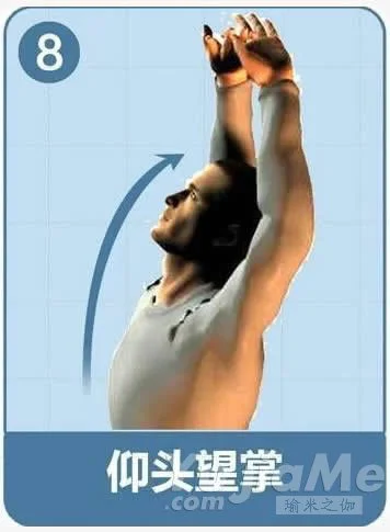 8、雙手上舉過頭,手指交叉,掌心向上。將頭仰起看向手背。保持5秒。