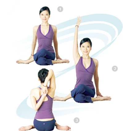 動作:坐於地板,兩腿互相交叉,雙膝上下一條直線,雙腳分別放於異側的臀部旁邊。雙手在背後相扣,保持背部的挺拔。如果感覺困難,可雙手抓住一條毛巾,效果相同。