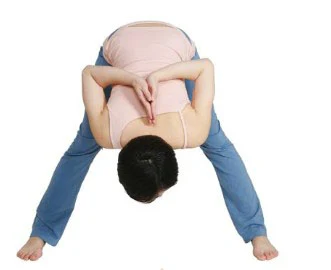 動作:雙腿分開與肩同寬,俯身,把手放在腳心下面,讓手心與之相通,吸氣的時候抬頭,呼氣的時候緩慢放鬆。