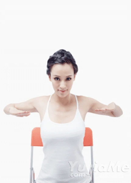 端坐,上身挺直,自然呼吸,左臂向右伸展,左手置於右肩;右手托住左肘盡量向右後方移動;保持五個呼吸隨後換另一側重複上述動作。