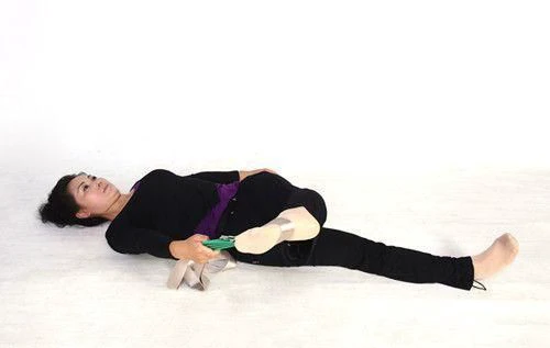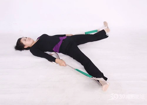 喜歡單腿拉筋的朋友可以躺在床上這麼做。帶子掛在兩腋下,分別抻拉兩條腿。為防止帶子下滑,身下可以壓一條毛毯,將帶子從毯下穿過,如此,後背不會受太多拉力,拉筋舒適持久。