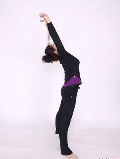 雙手握住一條拉筋帶兩端,舉起,最大角度後仰,抻拉胸腹部經絡。胸腹部經絡眾多,每天拉上幾分鐘,心經、心包經、肺經、脾經、肝經、腎經、胃經有極好的疏通和保健作用,同時,你彎曲的脊柱會“步入正軌”。
