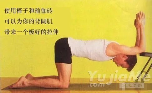 無論你的背闊肌是柔韌還是僵緊,第二種方法 用輔助工具為手臂提供正位及穩定,都可以更有效地加深你的拉伸。以下是一個好的方法來做。膝蓋跪於椅子前方一塊摺疊的毯子上。你也可選用一塊不打滑的墊子,鋪在椅子的坐墊上。夾一塊瑜伽磚在前方,一手在一條短邊。當你在體式之中時,這塊磚將把前臂固定在分開的狀態,以此保證你的上臂的完全的旋轉。所以選擇一個夾磚的方式,使得你的手和手腕盡可能的遠離彼此。屈肘90度,小心的把手肘的後部,靠近末端處,放在椅子坐墊的前緣,兩肘與肩同寬,或者稍微再近一點。如果把手肘放在椅子上有困難,用一條瑜伽帶套在你的前臂,靠近肘的部位。調整你的手肘的末端的位置,使得它們盡可能地靠近椅子的前緣,但又不至於滑脫下去,在你對它們施加力的時候。