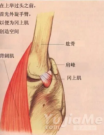 當拉伸背闊肌時,另一個重要處是,在你上舉手臂之前,就有力的外旋你的手臂,在上舉的過程中,以同樣的方式保持這個外旋,並且更加有力。這不僅對拉伸的效果很重要(因為它保持了背闊肌上端在上臂骨的旋繞),它還可以預防你的旋轉套肌中的一條肌肉 岡上肌受傷。岡上肌位於肩胛骨上部的一條骨窩(岡上窩)裡。在肩胛骨上部有一條骨性突起叫肩峰,岡上肌的肌腱穿過位於肩峰下面以及上臂骨頂端(肱骨頭)上面的狹小空間。這條肌腱到達肱骨頭的的外端,並附著於那裡。