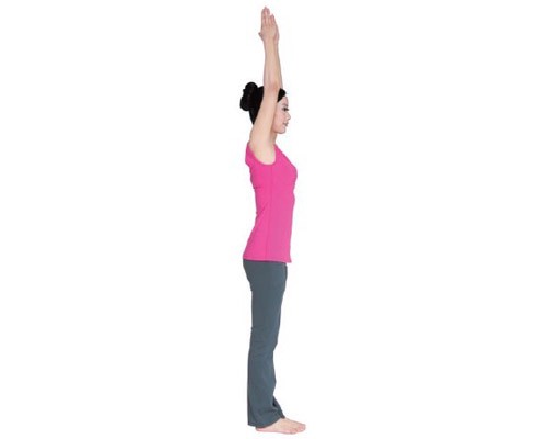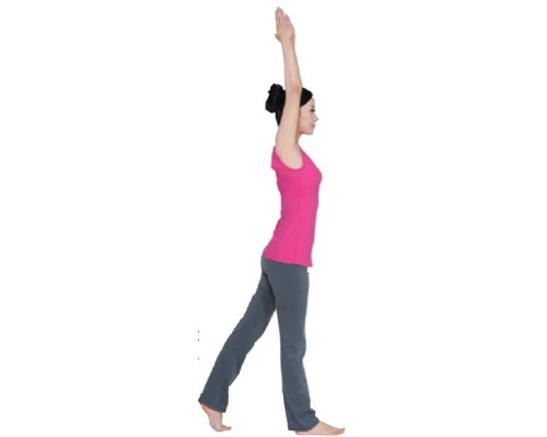 1山式站立,双腿并拢伸直,脊柱挺直,双臂在头顶上方合十,手臂带动脊柱尽量向上伸展。