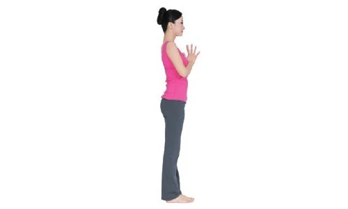 回到山式站立,双手在胸前合十,但手指尽量张开,帮助安定神经.