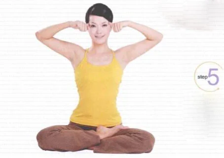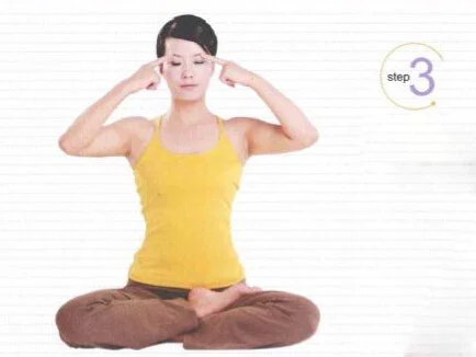 5、將雙手大拇指放在兩側太陽穴位置,其餘四指握拳,輕揉太陽穴18次。