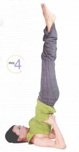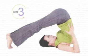 3、吸氣,腰背部和臀部向上抬高,雙腿伸向頭部後方,直到腳尖點地。