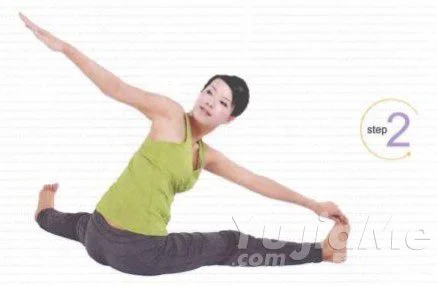2、吸氣,雙臂從身體兩側上抬,與地面平行,呼氣,從腰為軸,身體右轉,左手手指觸碰右腳腳趾,右手指向左後方,眼睛看向右手指尖方向。吸氣,上身回到正中。呼氣,換做另一側練習。
