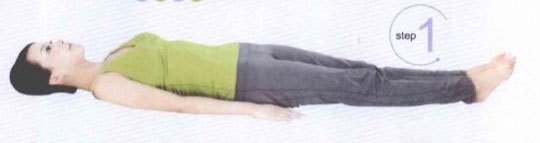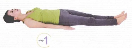 1、仰臥在墊子上,雙膝併攏向前伸直,雙臂放於身體兩側。