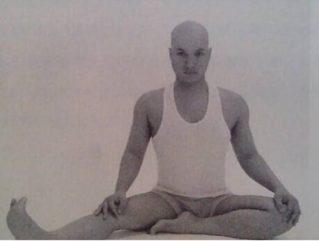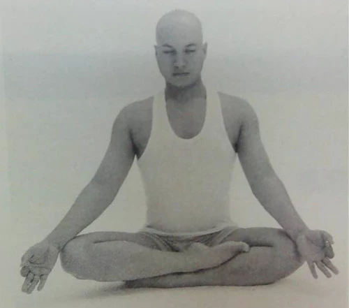 這個體式與前面的吉樣坐體式的唯一的區別在於腳跟的安置方法。在吉樣式中右腳或左腳彼抵在相對的腿的腹股溝內側,但在平衡坐式中右腳和左腳跟抵在恥骨處。做法如下:當練習者的左腿已經摺疊好後,用左手抓住左腳跟,右手抓住左腳趾,然後將左腳跟朝上翻轉並且使腳趾朝下,保持這種狀態將左腳跟抵在前面的恥骨處,腳掌朝上,左腳背與地面接觸,如圖所示。要特別注意,這時候生殖器處於腳跟的下面,不要施加壓力在生殖器上。另一條腿同樣的摺疊,腳跟放在左腳跟的上面並且也抵在恥骨上,上面這條腿的腳趾部分插入先摺疊那條腿的大腿和小腿肚之間。