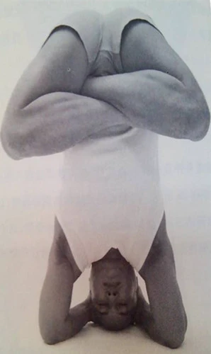 到目前為止,我們已經描述了這個完全顛倒的體式的幾個不同階段。當練習者有規律地練習這個體式一段時間以後,他就能夠很好地控制自己的身體,並且發現自己完全可以保持平衡了一使他可以在倒立時完成肢體的各種摺疊和扭轉的動作,而不會擔心倒下來.這時就可以進入更高階段的練習了。
