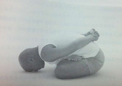 練習的第一步是準備雙腿相盤。盤腿的相關細節已經在前面魚式中詳細地描述了。在這裡注意要將兩腳的腳跟分別壓在與它們接觸的腹部相應的位置。左腳的腳跟的位置稍高一些,以便使它可以加壓在骨盆環上(骨盆是由骶骨、尾骨、髖骨連接而成的堅硬的骨環結構。—譯者注),右腳的腳跟壓在盲腸的位置。當雙腿盤好以後,雙手在背後相握。右手從手腕處抓住左手。接下來練習者將自己的身體向前彎曲,盡量將身體壓向雙腳的腳跟上並使前額與地面接觸。