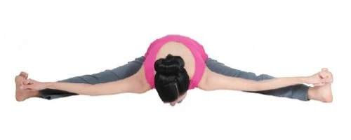 4向前彎曲上身,同時雙臂向兩側伸直,兩手分別抓住左右腳的大腳趾,直至上身及下巴都貼近地面,保持姿勢20秒.