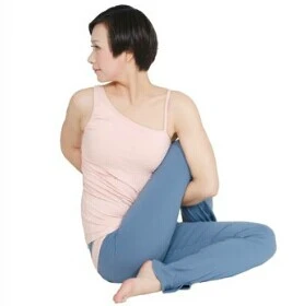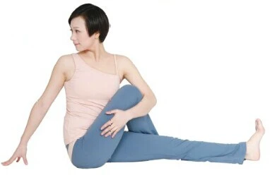 5.上身繼續向右後方扭轉,右手臂彎曲,左手臂穿過右膝蓋窩向後,與右手在被背後交叉相握,眼睛看向肩後方,保持姿勢20秒。