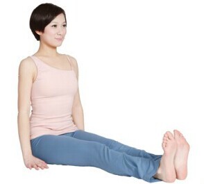 1.坐在墊子上,雙手向前併攏伸直,挺直腰背,雙手自然垂放在身體兩側,掌心貼地,眼睛平視前方。