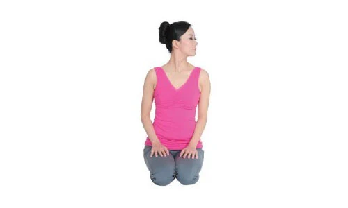 3吸氣,身體挺直,將頭部盡量向後仰,拉伸頸部前側。保持姿勢20秒後,呼氣,頭部回到正中。
