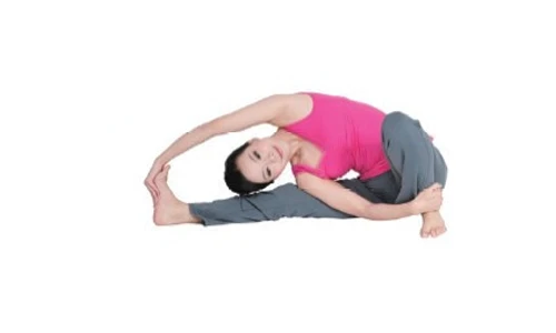 4吸氣,身體向右彎曲,直到右肩部觸碰到右膝內側,左手抓住右腳腳趾,保持姿勢20秒。休息片刻,換另一邊重複動作。