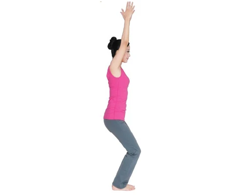 3彎曲雙膝,慢慢向下蹲,重心微微向前,感覺自己就像坐在一把椅子上,保持姿勢20秒。