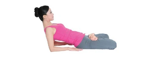 2吸氣,雙臂向後彎曲手肘撐地,同時慢慢向後放低上身,雙腿保持貼地狀態不動。