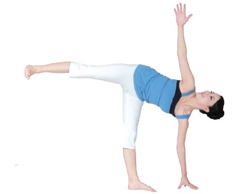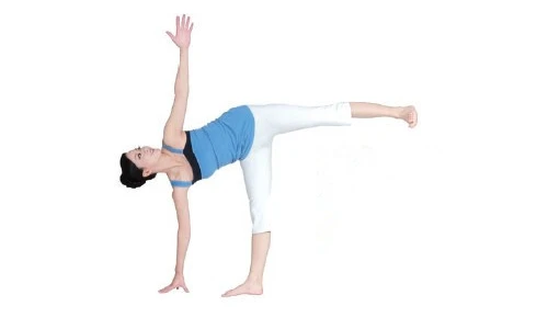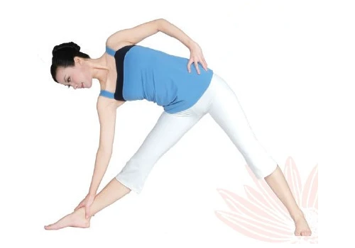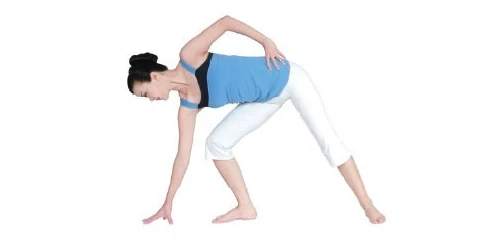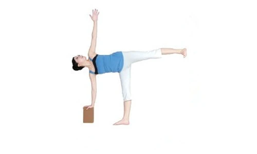 在腳邊一臂遠的地方放置一塊瑜伽磚,彎曲身體時,讓右手落在瑜伽磚上,以降低身體彎曲的幅度,增加身體平衡.
