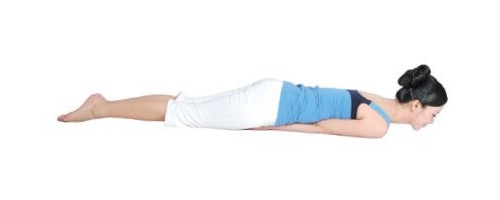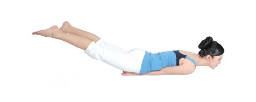 1俯臥在墊面上,雙手置於體側,掌心朝上,雙腿併攏伸直,下巴貼地。