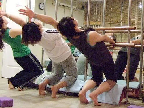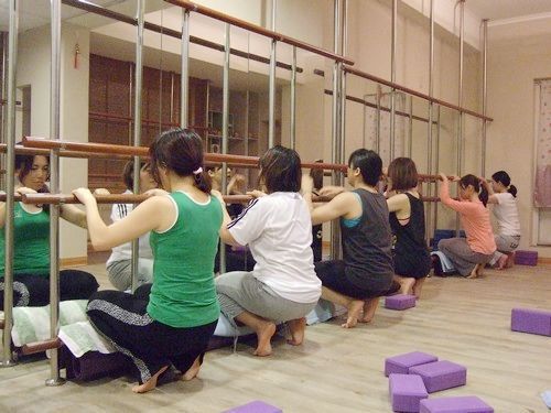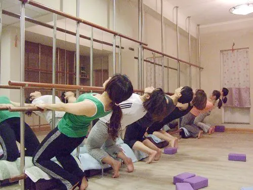1、 靠近把竿,先將瑜伽墊或毛毯,墊在最下層的把竿上,可紓解接下來練習時,跪姿動作膝蓋的不適。
