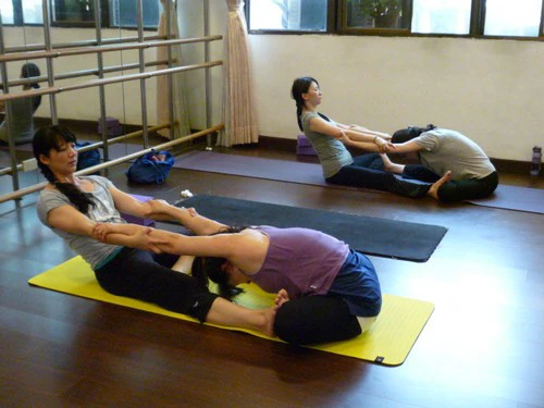 3、 互換角色練習,剛才前彎的同學,換成往後躺,同時引導伙伴前彎,停留伸展叄個吸吐後還塬,持續重複進行幾個回合。