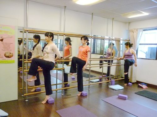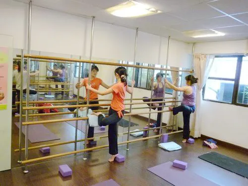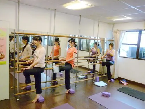 1、 靠近把竿,內側的腳跟(右腳)踩在瑜伽磚上,左腳抬起離地,將左腳彎曲,腳背放在把竿上,若覺得腳背不舒服,可將毛巾墊在把竿上面當作緩衝。
