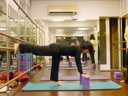 1、 取適當距離,背對把竿,左腳踩穩,右腳抬起約與臀同高,最後踩在把竿上,同時身體往前彎,雙手放在下方瑜伽磚上,背部保持直背,側面看起來從頭到腳呈一直線,骨盆不歪斜。